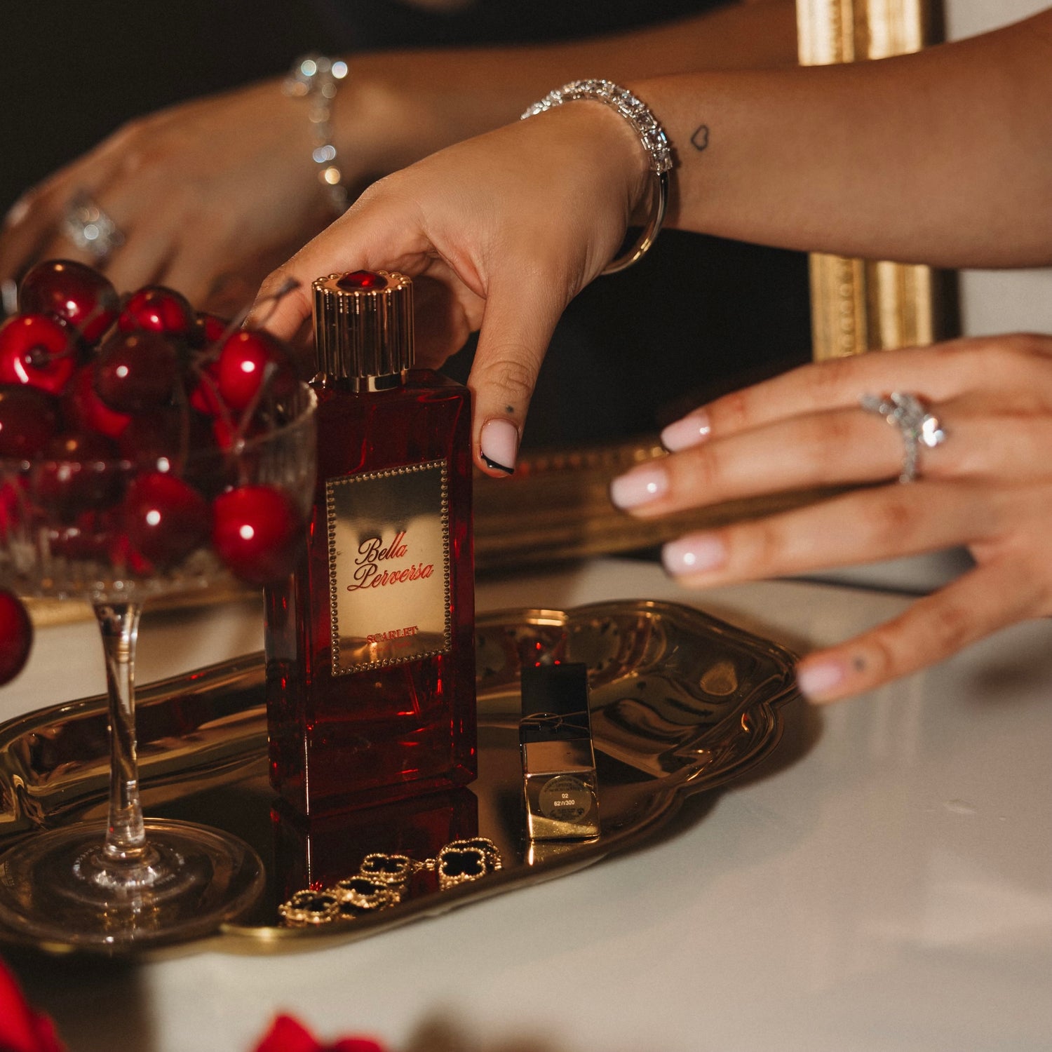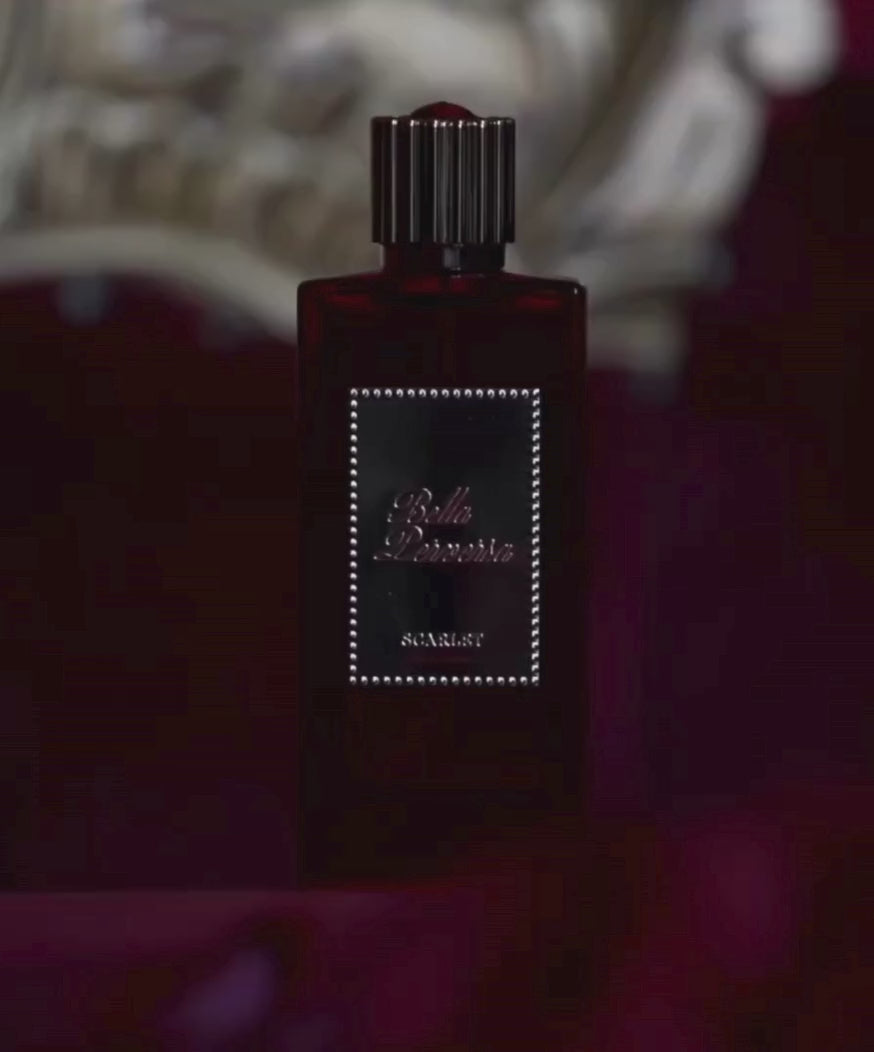 SCARLET opens with a bright blend of Bing Cherry and Green Mandarin, softened by fresh White Tea. A sensual heart of Jasmine, Orange Blossom, and Tuberose brings a touch of feminine allure, while the base of Vanilla, Coffee, and Patchouli adds a warm, captivating finish.